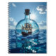 Ein Notebook zum Thema Ozeane. Ein Schiff in einer Flasche, das auf dem Meer schwebt. Eine atemberaubende Illustration für diejenigen, die ein nautisches Thema Liebe.