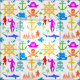 Ein nahtloses Muster von farbenfrohen Silhouetten von Ankern, Helmen, hohen Schiffen, Haien, Fischen, tapferen Piraten. Die Abenteuer der Ozean- oder Schatzinseln beginnen. Ein lustiges und positives Design für jeden. Sie können die Farbe des Hintergrunds, das Kippmuster, die Größe und den Rotationswinkel ändern. Seien Sie einfach kreativ, nutzen Sie dieses schöne Gewebe für jedes Ihrer Projekte und seien Sie glücklich!