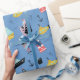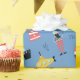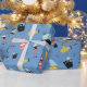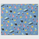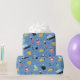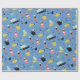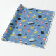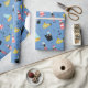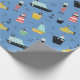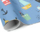 Auf einem hübschen Papier mit Segelbooten und Schiffen aus dem Cartoon in Gelb und Schwarz, niedlichen U-Booten, einem Segler mit schwarzem Bart, einer roten Hose und einer Pfeife, einem rot-weißen Leuchtturm und einem schwarzen Anker auf hellblauem Hintergrund mit kleinen Blasen und Wellen.