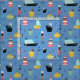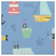 Sehr schön mit Segelbooten und Schiffen aus dem Cartoon in Gelb und Schwarz, niedlichen U-Booten, einem Segler mit schwarzem Bart, einer roten Hose und einer Pfeife, einem rot-weißen Leuchtturm und einem schwarzen Anker auf hellblauem Hintergrund, der mit kleinen Blasen und Wellen geschmückt ist.