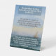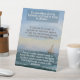 Das Schild "Pedestal" ist ein Plakat mit einer friedlichen Ozeanszene im Hintergrund. Der Text auf dem Plakat ist in weiß und braun, mit einem Zitat über das Infragestellen und Vertrauen Gottes. Es betont, dass es für den Menschen natürlich ist, Gottes Geheimnisse in Frage zu stellen, aber wahrhaftiges spirituelles Wachstum kommt aus dem Vertrauen in Seinen Rat. Das Poster benutzt die Analogie eines Seemanns, der durch den Ozean navigiert, ohne alles darüber zu wissen, um das Konzept des Vertrauens in Gottes Führung zu veranschaulichen.