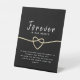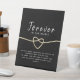 Elegantes, schlichtes Tafelschild mit Schwarz-Weiß-Gedenktafeln an den Hochzeitstischen mit Imitaten goldenes Seilherz und modernem Kalligrafiebeschreiben.