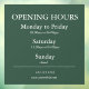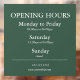 Gestalten Sie Ihre Geschäftszeiten stilvoll und klar mit diesem anpassbaren Fensteraufkleber! Perfekt für Schaufenster, Türen und Fenster, zeigt dieser wiederverwendbare Aufkleber Ihre Öffnungszeiten mit einem sauberen, professionellen Design, das ins Auge fällt. Einfach anzubringen und zu entfernen, ohne Rückstände zu hinterlassen - ideal für Geschäfte, Cafés, Salons und Büros.