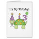 Eine niedliche grüne lächelnde Schildkröte mit einem Party trägt eine beleuchtete Geburtstagskandle auf seinem Rücken und lautet "It's My Birthday". Ein Helium-Ballon trägt die Nummer 3!