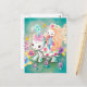Kleines Rosenelfenmädchen mit langweiligen, orangefarbenen Haaren, mit rosa Rosa dekoriert, in blauem Kleid gekleidet und mit blauen Leggings gekleidet, mit einer lustigen Schildkrötenfahrt! Die magische Schildkröte ist weiß, mit grünen Flecken, und ihre Muschel hat rosa Rosen darauf. Sie trägt ein großes rosa Gewand (sie ist schließlich eine magische Schildkröte). Gepunktete Pilze und helle Blume sorgen für eine gelbe Gartenpalette, und die Schmetterlinge sind gelb.