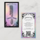 Veredeln Sie Ihre Haarstudio- oder Stylistenmarke mit unserer iridischen holografischen Vintage-Haarstudio-Visitenkarte mit einem handgezeichneten, aufwendigen Rollrahmen, der vor einem falschen iridischen holografischen Hintergrund für einen auffallenden, tarot-inspirierten Look platziert ist. Die Vorderseite zeigt einen Vintage-Kamm, der innerhalb des Rolldesigns zentriert ist und Platz für Ihren Firmennamen und Slogan lässt, während die Rückseite elegante Schnörkel, einen iridischen holografischen Rahmen und Ihre Kontaktdaten mit einem QR-Code für einfache Buchungen zeigt. Die dramatische Mischung aus Schwarz und gepaart mit schimmernden holografischen Akzenten schafft eine anspruchsvolle gotische Ästhetik, perfekt für Haarstudios, Hairstylisten, Barbierläden und Schönheitsprofis, die eine einzigartige, mystische und vintage-inspir