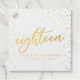 Schimmernde goldene Glitzer-Effekt-Sterne funkeln auf Konfetti rund um den Rand dieser wunderschönen weißen und goldenen achtzehnten Geburtstagsparty Gunst Tags, mit einem Gold-Folie Skript lesen, "achtzehn". Ideal für einen extravaganten, schicken Abend! Original-Kunstwerk von Colleen Michele. Zurück hat Sternmuster vor einem samtig schwarzen Hintergrund.