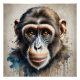 Ein Schimpanse mit detaillierter Wasserfarbe mit ausdrucksvollen Augen wird vor einem weichen, verschwommenen Hintergrund dargestellt. Die natürlichen Farben verstärken das lebensechte Aussehen.