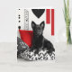 Schipperke Valentinenkarte. Knuddeliges Set aus Hunde vor einem zeitgenössischen Hintergrund in Rot, Schwarz und Weiß. Keine Blume, nur Herz und Tüten der Süße. Im Inneren wird für Ihre eigene Nachricht leer verlassen.