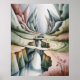A stunning surreal watercolor featuring towering, jagged mountains in soft pastel tones framing a deep canyon. A winding river flows beneath an elegant stone arch bridge, with sparse vegetation adding life to the dramatic scene. This imaginative fantasy landscape is ideal for wall art, posters, and adventurous decor.