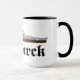 Tasse mit Zeichnung des berühmten deutschen Schlachtschiffs Bismarck aus dem Zweiten Weltkrieg mit dem Namen des Schiffes in Frakturschrift.