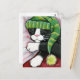 Niedliche Postkarte für Katzenliebhaber mit einem Bild von Lisa Marie Robinson. Eine Tuxedo Katze schläft schnell im Bett ein. Die Katze trägt eine grüne und gelb gestreifte Nachtkappe. Copyright © Lisa Marie Robinson. Alle Rechte vorbehalten.