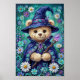 Ein kleiner Bär, zart wie ein Schlafzauber, sitzt im Herzen einer Wiese aus Mitternacht und Blüten. Rundäugig und sanft trägt er einen tiefblauen Zauberhut und -mantel, beide übersät mit Sternen und mit violettem Licht geschmückt, als wäre der Himmel selbst in Stoff genäht worden. Ein Kristallanhänger ruht auf seiner Brust, der sanft wie ein eingefangener Mondstrahl leuchtet. Um ihn herum sammeln sich Blumen in einem hellen, atmenden Kreis – weiße Blütenblätter, violette Blütenblätter, gelbe Herzen – jede Blüte bemalt mit dem Flüstern des Frühlingsregens und der Freude des Morgens. Das Fell des Bären ist warmes Honig und Creme, weich genug, um es allein mit den Augen zu spüren, eine stille Laterne im kühlen Schein des Gartens. Eine winzige Pfote hält einen Kristallstab, der das Licht einfängt, ein kleines Stückchen Magie
