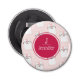 Ein Flaschenöffner mit einem individuelle Name und Monogramm als Initialzündung in einem rosa Kreis. Entworfen mit einem niedlichen Muster schlafender Kätzchen, die überall friedlich und glücklich aussehen. Rosa Hintergrund.