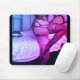 Schlafzimmermauspad für Zuhause-Raum, persönlicher Raum, mit einem Bild einer Frau im Schlafzimmer stehend. Fuchsienfarbe mit schwarzem Schnitt.