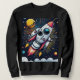 Ein Raketenschiff im Retro-Stil strahlt in einen bunten, sternenförmigen Kosmos aus. Es ist spielerisch mit großen Augen und einem freundlichen Gesicht gestaltet und verleiht der Szene eine Touch von Launen. Der feurige Auspuff der Rakete und die lebhaften Planeten im Hintergrund schaffen ein Gefühl für dynamische Bewegung und Abenteuer.