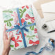 Trendy Weihnachtsbogenpapier in den Farben Grün, Rot, Blau und Rosa.