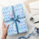 Eine große Auswahl an Schneeflocken Formen, Farben und Größen, die in einem nahtlosen, sich wiederholenden Muster angeordnet sind, das einen wunderbaren dreidimensionalen Effekt hat. Weiße, aquamarine, blaue und lavendelfarbene Flecken auf einem soliden, weißen Hintergrund. Herrlich und einzigartig. Von Melissa J Barrett