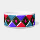 Diese phantastische Schüssel hat ein abstraktes Muster mit roten, hellblauen und dunkelblauen Diamanten. Jede Zeile wird durch eine Reihe schwarzer Diamanten getrennt. Jeder der schwarzen Diamanten hat ein Loch in der Mitte. Das obere links von jedem Single Diamant sieht aus, als ob es glänzend ist. Hier ist das lustige Stück, Sie können dieses Loch mit einer Auswahl von über 200 Farben füllen, um ein einzigartiges Design zu machen. Hier wurden die Löcher mit einer durchstechenden, leuchtend rosa Farbe als Beispiel gefüllt. Um Ihre Farbe auszuwählen und den Effekt auf das Design zu sehen, klicken Sie einfach auf den Button "Anpassen", gehen Sie in den Farbbereich und klicken Sie auf den Hintergrund und wählen Sie dann die Farbe aus, die Sie in das Design einfügen möchten. Sie können so viele Farben wie Sie möchten ausprobieren, bis Sie die für Sie geeignete finden.