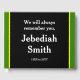 Dieses einfache Begräbnis- oder Gedenkbuch enthält die Meldung "Wir werden uns immer an dich erinnern" und die individuelle Name- und Geburts-/Sterbedaten des weitergegebenen Individuums. Es könnte verwendet werden, um die Erinnerungen von jemandem aufzuzeichnen, der vor kurzem verstorben ist.