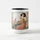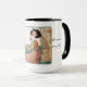Tasse im Retro-Stil mit einer Teeliebhaberin, die ihren Tee serviert, zwei Katzen in der Nähe, Spitzen-Vorhänge und ein charmantes Sprichwort für Teefans.
