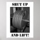 Ein schwarz-weißes Poster mit fünf Tellern auf der Bar. Es hat eine schwarz-weiße Grenze, mit der Phrase "SHUT UP AND LIFT!" darauf geschrieben. Ein Muss Plakat für alle, die ihre Ausbildung ernst nehmen! Gewichtszunahme, Übung, Fitnessraum, Motivierend.