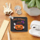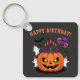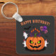 Cartoon Kürbisgebäck Geburtstagskuchen mit Schädelballons, Gespenstern in Party Hüten, gruselige Kerzen und Fledermäuse zu einem lustigen Halloween-Geburtstag.