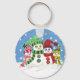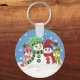 Ein Schlüsselanhänger mit einem runden Knopf mit einer farbenfrohen Schneemannsfamilie © ArianeC Illustrations