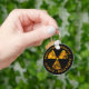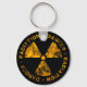 Schwarzer Schlüsselanhänger mit stark beängstigenden, gelben Strahlungszeichen und Warnhinweisen.