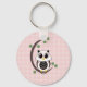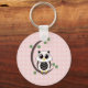 Custom Basic Button Schlüsselanhänger mit einem Vektorgrafik-Design eines niedlichen rosa, weißen und schwarzen Uhus auf einem halbmondförmigen Zweig mit Blätter und einem rosa Polka Dot Muster Hintergrund.