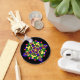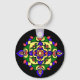 Ein Schlüsselanhänger mit einem bunten Rangoli-Muster auf schwarzem Hintergrund, von einem digitalen Design von Judy Adamson. Perfektes kleines Geschenk für Diwali!