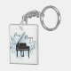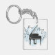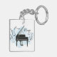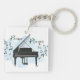 Ein Schlüsselanhänger für diejenigen, die Klavier spielen Liebe, Geschenke für Musiklehrer und Pianisten. Das Design auf dem Schlüsselanhänger ist ein schwarzes Klavier mit Musiknoten, die auf einem blauen Aquarellboden herumschwebend sind.