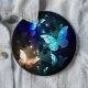 Fantastisch, leuchtend, blau und gelb, Nachtschmetterling auf dunklem Hintergrund.