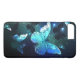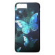 Fantastisch, leuchtend, blau und gelb, Nachtschmetterling auf dunklem Hintergrund.