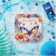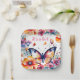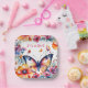 Ein hübscher Schmetterling, umgeben von rosa, blau, orange und violett blühenden Aquarellbildern, das Baby duscht personalisierte Teller.