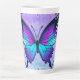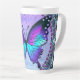 Ein lebendiger Schmetterling mit blauen und lila Farbtönen zentriert sich in einem verzierten, kreisförmigen Design, umgeben von aufwändigen Blumenmustern und dekorativen Juwelen. Die Gesamtkomposition verströmt eine Buntglasästhetik mit einer harmonischen Mischung aus Farben und Symmetrie.