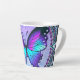 Ein lebendiger Schmetterling mit blauen und lila Farbtönen zentriert sich in einem verzierten, kreisförmigen Design, umgeben von aufwändigen Blumenmustern und dekorativen Juwelen. Die Gesamtkomposition verströmt eine Buntglasästhetik mit einer harmonischen Mischung aus Farben und Symmetrie.