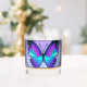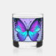 Ein lebendiger Schmetterling mit blauen und lila Farbtönen zentriert sich in einem verzierten, kreisförmigen Design, umgeben von aufwändigen Blumenmustern und dekorativen Juwelen. Die Gesamtkomposition verströmt eine Buntglasästhetik mit einer harmonischen Mischung aus Farben und Symmetrie.