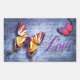 Schmetterlinge und Liebe-Text auf blauem Texturhintergrund mit kalligrafischem Kunstwerk.