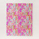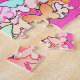 Puzzle in einer Herde von Schmetterlingen in weichen Tönen von Rosa, Pfirsich, Aqua und Orange vor einem tiefen fuchsienrosa Hintergrund
