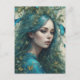 Eine Frau mit türkisblauem Haar ist umgeben von lebendigen blauen Schmetterlingen, die eine ätherische und traumhafte Szene schaffen. Ihr ruhiger Ausdruck ergänzt die natürliche Schönheit und Bewegung der Blätter, die mit ihren Haaren verwoben sind.