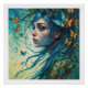 Eine Frau mit fließendem, aquafarbenem Haar ist von zahlreichen bunten Schmetterlingen umgeben, die der Szene ein Gefühl von Laune und Magie verleihen. Ihr Ausdruck ist ruhig und doch faszinierend, harmonisch mit den lebendigen Schmetterlingen, die um sie herum flattern.