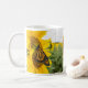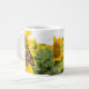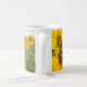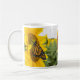 2 verschiedene Bilder auf der rechten Seite und eines auf der links Seite von Monarchschmetterlingen auf Sonnenblumen machen diese Kaffeemaschine-Tasse aus.