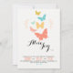 Eine trendy Einladung mit den bunten, flatternden Schmetterlingen gegen ein Weiß, Leinwandhintergrund. Vervollkommnen Sie für jede weibliche Feier.