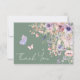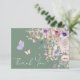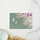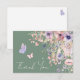 Diese flache Dankeskarte ist entworfen, um zum süßen und wunderlichen Thema "Ein kleiner Schmetterling ist auf dem Weg" zu passen. Die Vorderseite zeigt einen weichen Salbeigrün-Hintergrund mit weißer Schrift für einen frischen und eleganten Look. Wasserfarben-Wildblumen und Grüntöne akzentuieren das Design, während rosa und violette Schmetterlinge um die Worte "Danke" in einer eleganten handgeschriebenen Kalligrafie flattern. Die sanfte Farbpalette aus Rosa, Staubrose, Lilac, Lavendel, Violett und frischen Grüntönen passt perfekt zum Salbei-Hintergrund.