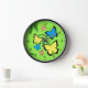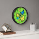 Farbenfrohe Schmetterlinge auf einer Wanduhr mit Zahlen und Bindestrichen auf einem grünen Hintergrund