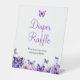 Mit unserem Butterfly Baby Shower Diaper Raffle Ticket Pedestal Sign erweitern Sie Ihre Windelverlosungsstation. Dieses Schild mit einem prächtigen lila Schmetterling in einem lila Blumengarten verleiht Ihrem Baby-Duschdekor eine elegante Touch, während Sie die Gäste zum Vergnügen führen. Dieses Podestschild, das Teil der Lila Butterfly Baby Shower Collection ist, behalte Ihre Veranstaltung schön koordiniert und fügt dem Verlosungsbereich eine raffinierte Touch hinzu.