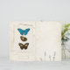 Vintage Junk Journal Seite mit blauen und braunen Schmetterlingswissenschaftlichen Illustrationen auf der Vorderseite und braune Schmetterlingsbilder auf der Rückseite. Französische Zeichnungen und Anmerkungen mit französischer Quittung liegen hinter dem ersten zeichnend Schmetterling. Illustrationen zur Wildblume von Lavendel- und Anisoid-Pflanze. Pergamentseiten mit Goldetiketten, Klebeband und Nähdetails in der Mitte. Falten Sie in der Mitte, um Journalseiten zu erstellen.