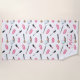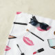 Desteis illustriertes Muster verschiedener Schminkprodukte zusammen mit rosa Lippen. Zu diesen Schminkprodukten zählen Lippenstift, Mascara, Pulver mit Spiegel und Schminkbürsten. Es gibt auch einen personalisierbaren Textbereich für einen Namen in rosa Farbe.