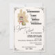 Einfache und lustige Hochzeitseinladung mit leicht zu aktualisieren Text für Ihre Angaben, die ein Paar in Silhouette oben links, stehend hinter einem bunten Kuchen auf einem Sockel mit rotem Band, und eine Flasche Schnaps mit einem Glas gefüllt mit Alkohol. Der kühne Schriftart neben ihnen lautet: "Zeit zum Schmooze essen Kuchen und feiern eine Hochzeit". Ihre Namen sind in hübschen Skripten darunter, gefolgt von Ihren spezifischen Informationen in einem einfachen schwarzen Schriftart. Die Hintergrundfarbe ist cremefarben, aber Sie können sie ändern, wenn Sie es vorziehen.
